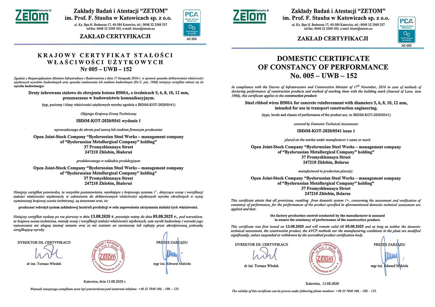 - 1. Certificate of conformity № 005-UWD-152 (Zetom, Poland) to produce cold-deformed rebar В500А with diameters 5, 6, 8, 10, 12 mm, intended for use in transport construction engineering