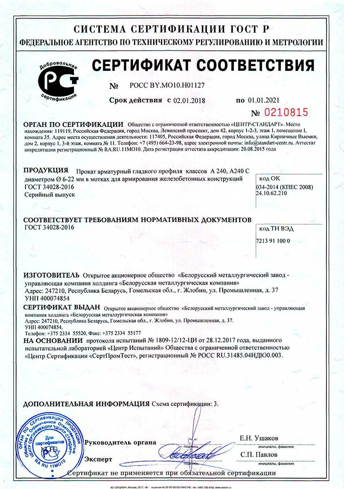 - 11. Certificate № ROSS BY.MO10.Н01127 (GOST-R) for producing hot rolled steel of class А240, А240С Ø 6-12 mm for reinforcing concrete - steel constructions according to the requirements of GOST 34028-2016