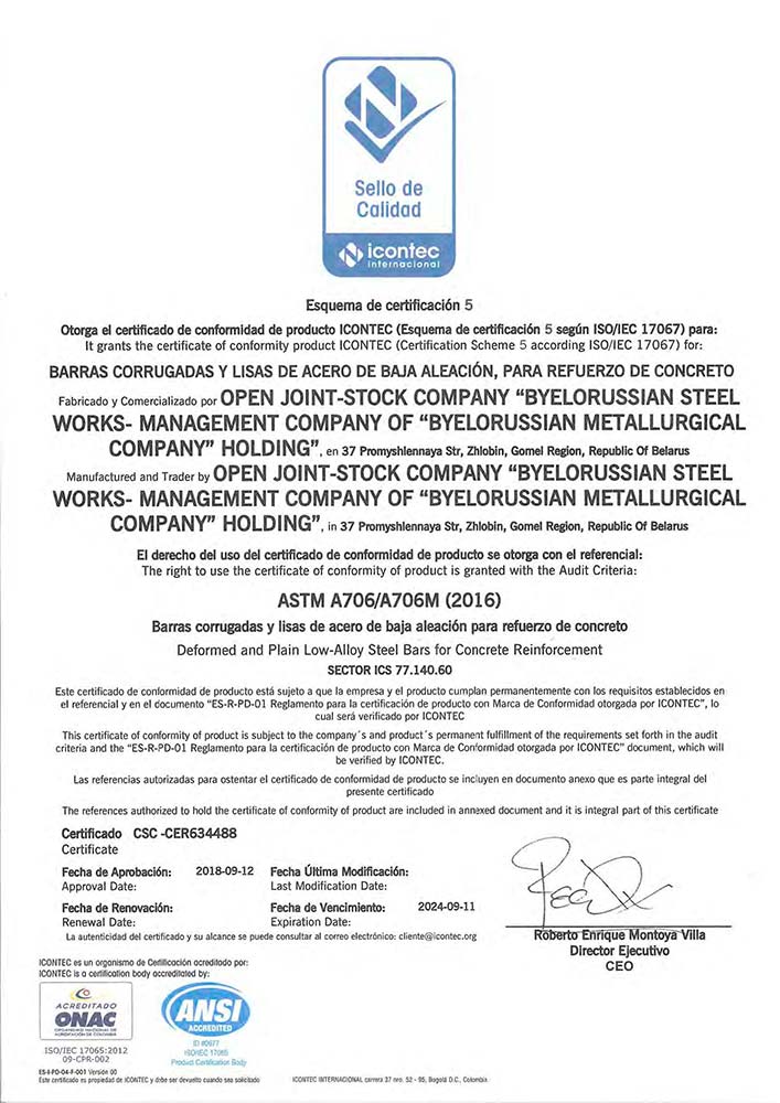 - 12. Certificate no. CSC-CER 634488 (ICONTEC, Colombia) for the production of profile and smooth low alloyed reinforcing steel for reinforced concrete structures in accordance with the requirements of ASTM A706/A706M (2016)