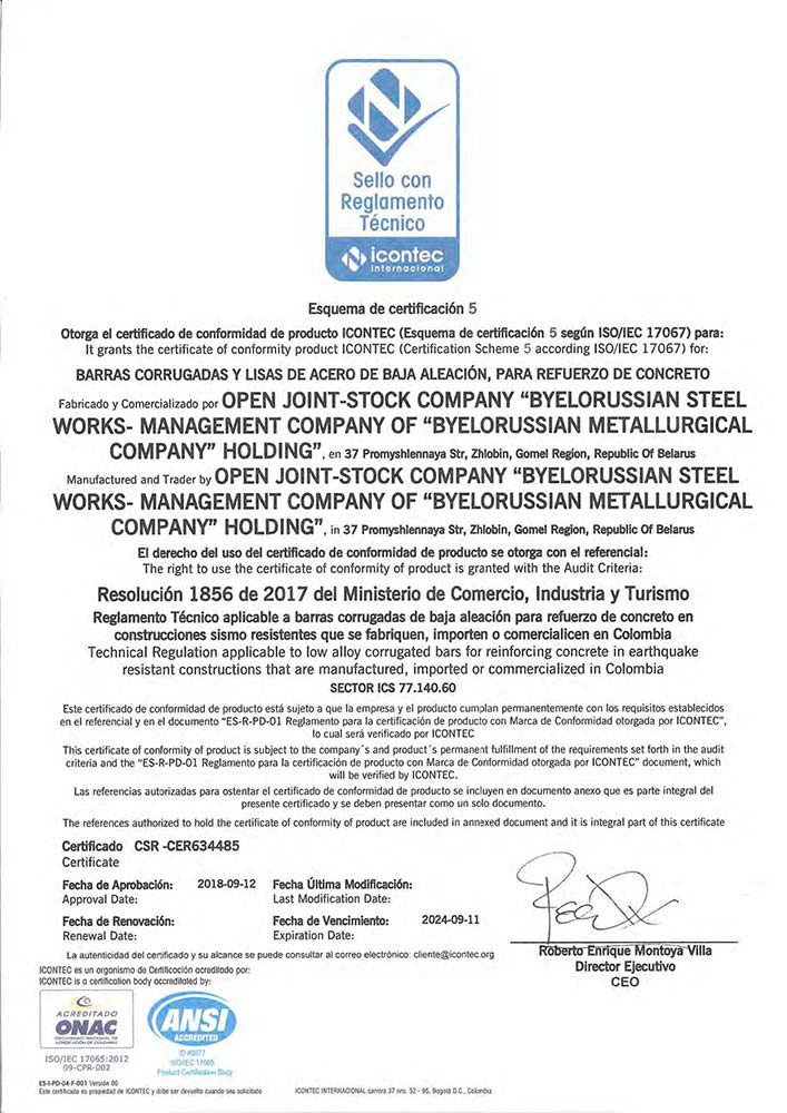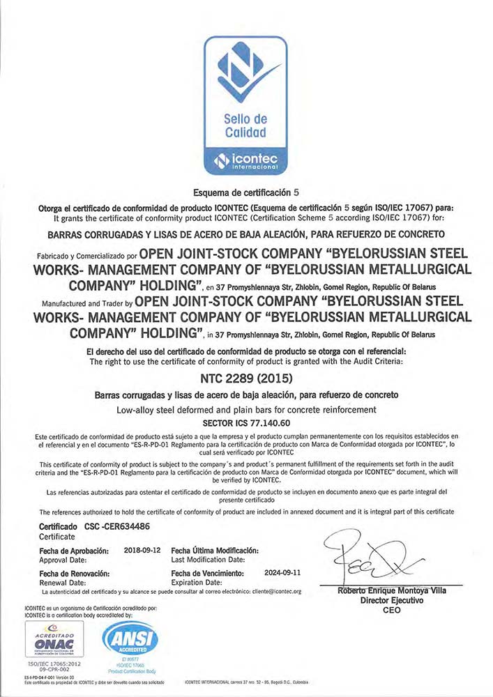 - 13. Certificate no. CSC-CER 634486 (ICONTEC, Colombia) for the production of profile and smooth low-alloyed reinforcing steel for reinforced concrete structures according to the requirements of NTC 2289 (2015)