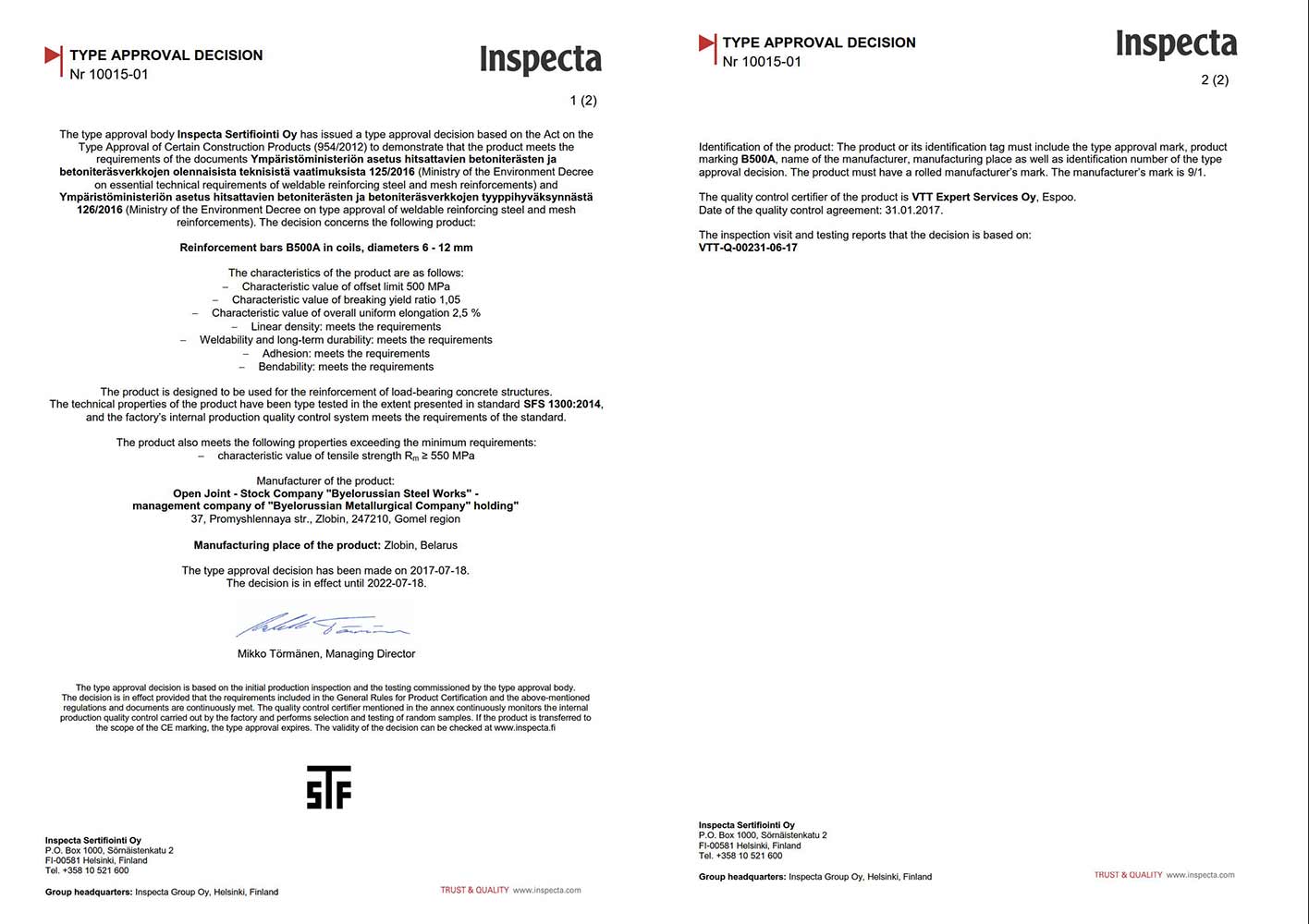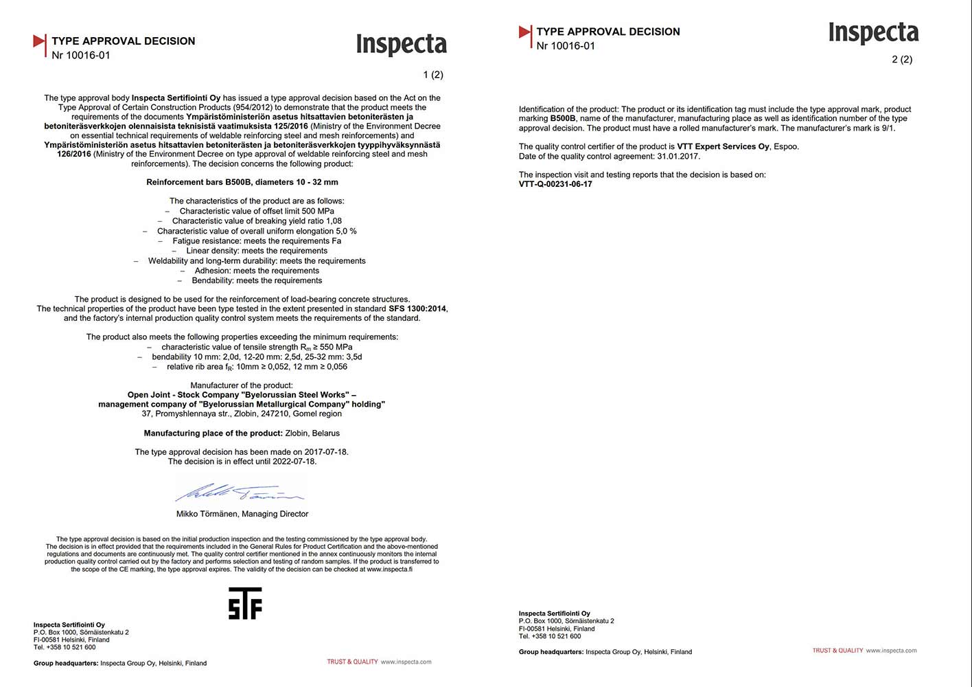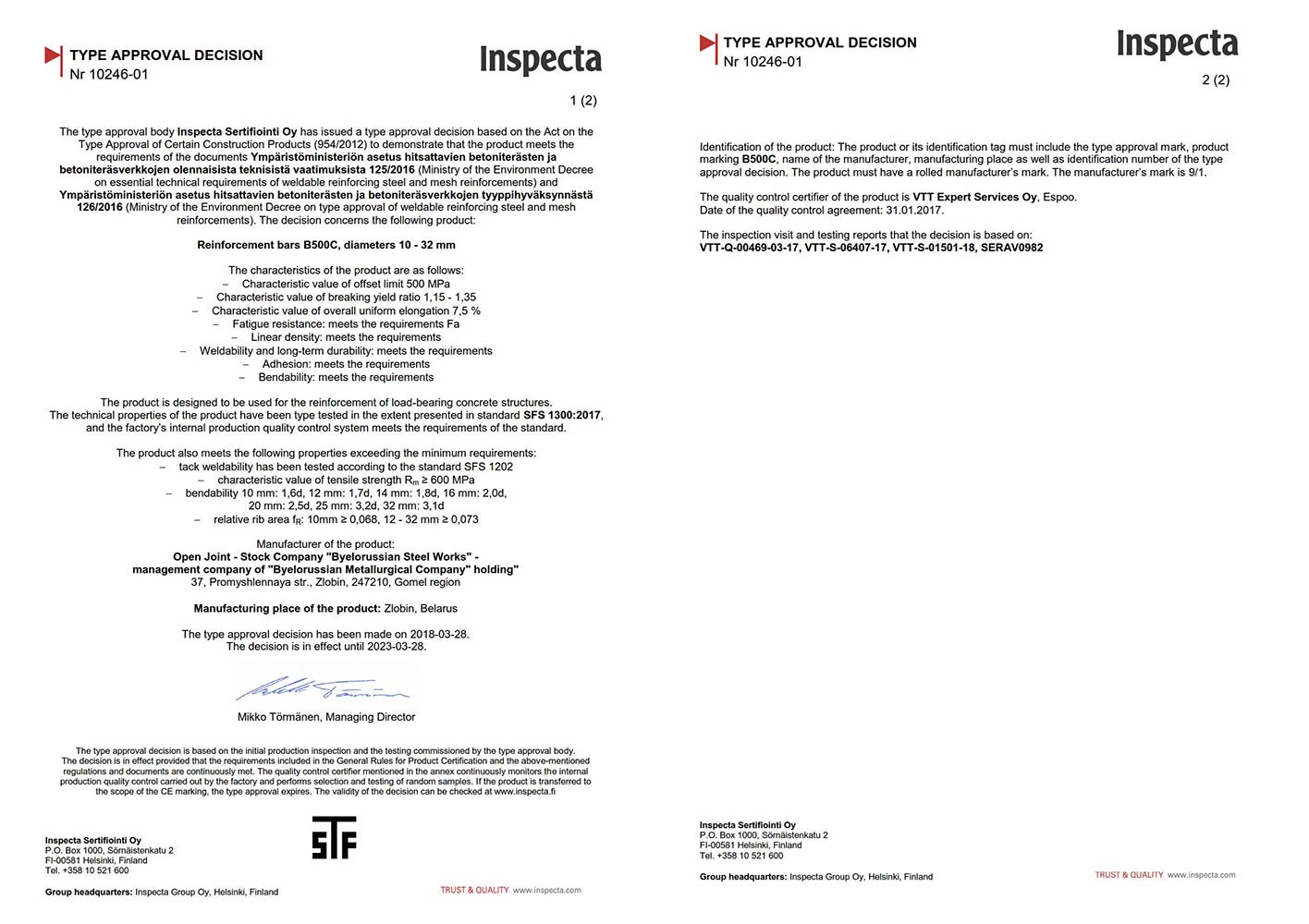 - 16. Certificate № 10246-01 (Inspecta, Finland) to produce hot rolled reinforcement bars В500C Ø 10-32 mm according to SFS 1300:2017 requirements