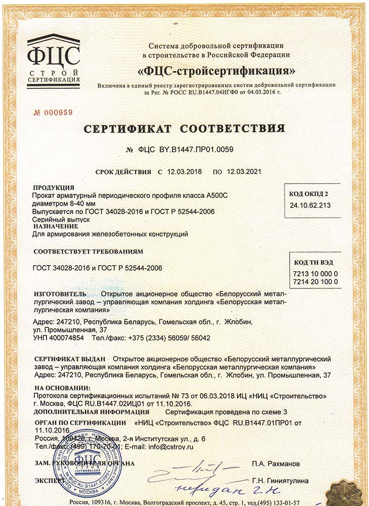 - 17. Certificate № FCS BY.B1447З PRO 1.0059 “FCS- stroicertification” (Russia) for production of reinforcing bars A500C Ø8-40 mm according to requirements GOST 34028-2016 and GOST R 52544-2006