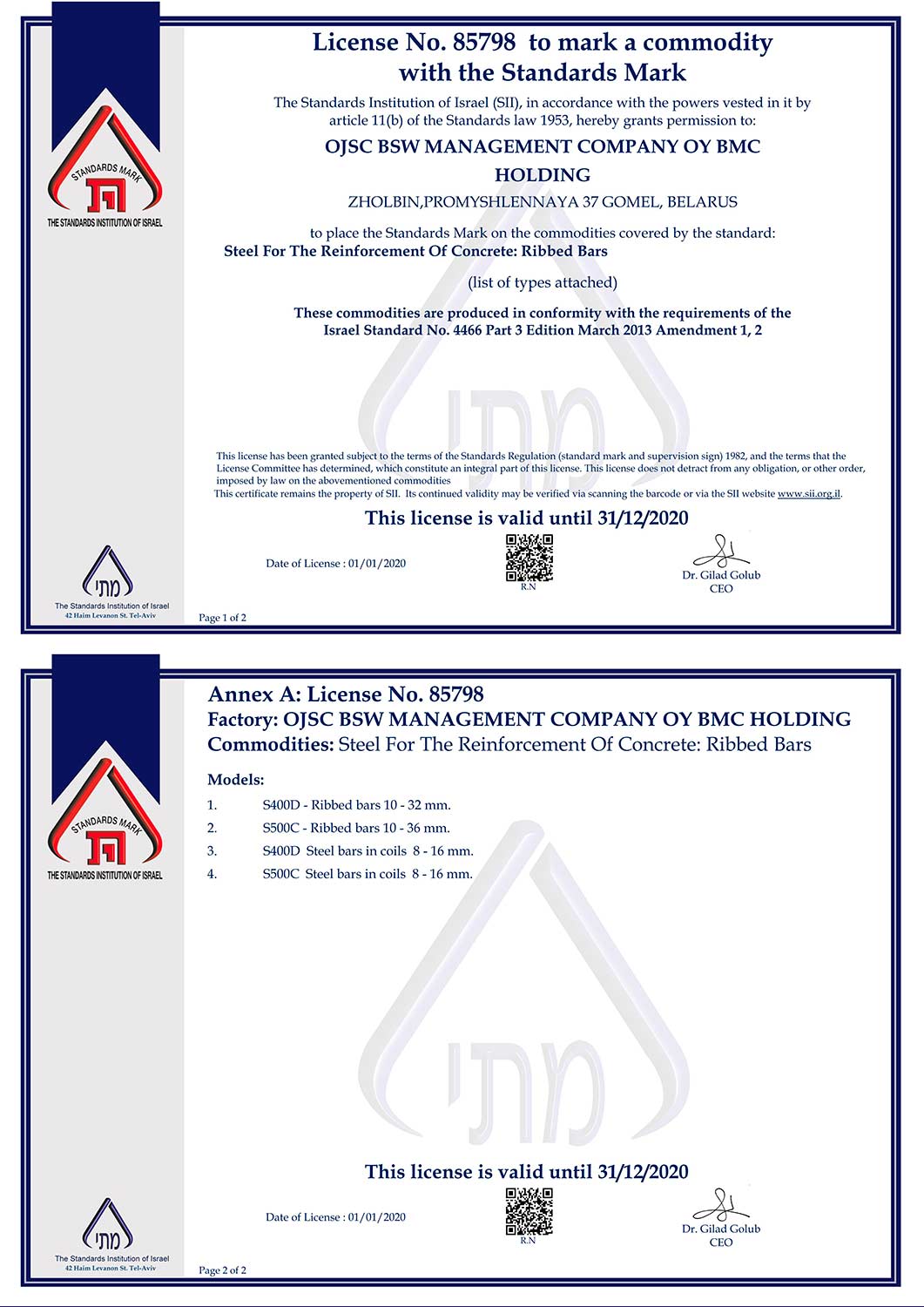 - 18. Certificate № 85798 SII (Israel) for production of reinforcing bars S400D Ø10-32 mm, S500C Ø10-36 mm and reinforcing steel in coils S400D, S500C Ø8-16 mm according to standard SI 4466-3-2016