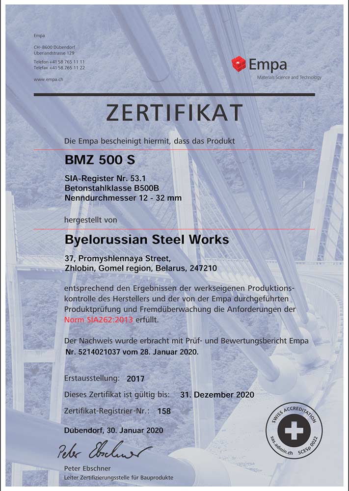 - 19. Conformity certificate № 158 Empa (Switzerland) to produce rebar in straight length B500В Ø 12-32 mm in accordance with SIA 262-2013.