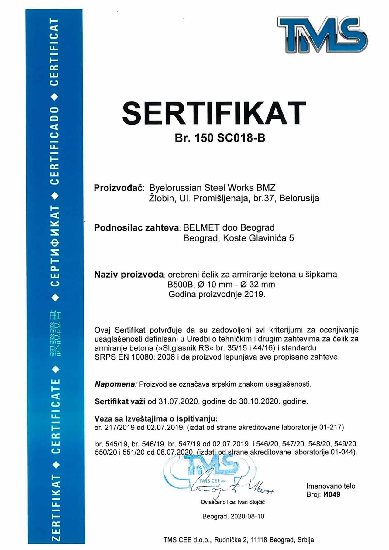 - 21. Certificate № 150SC018-B (TMS, Serbia) for manufacture of hot-rolled bars B500B Ø 10-32mm according to the requirements of SRPS EN 10080-2008