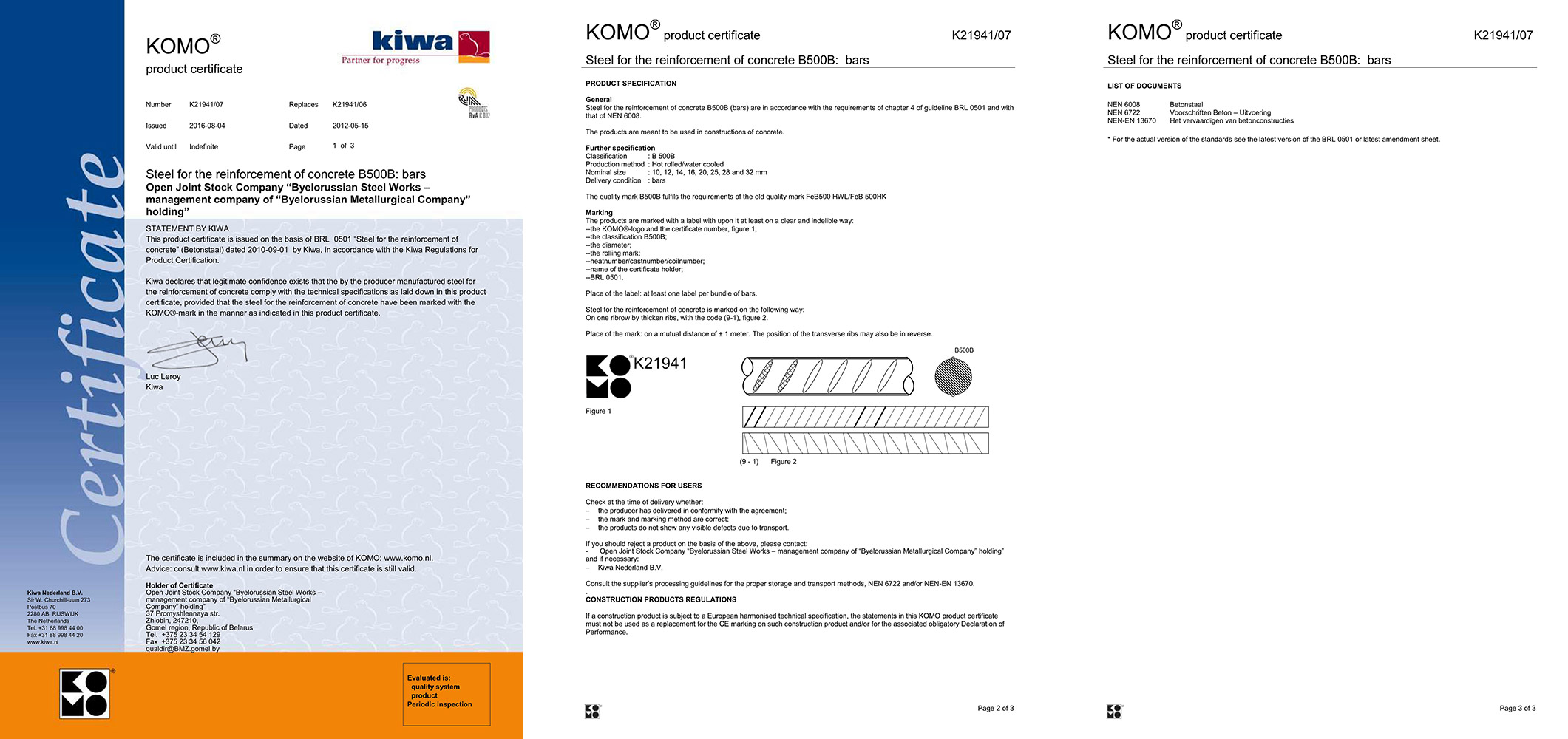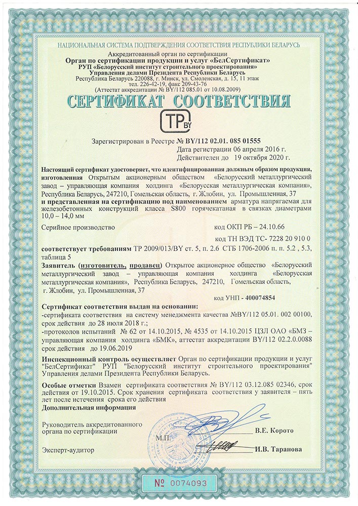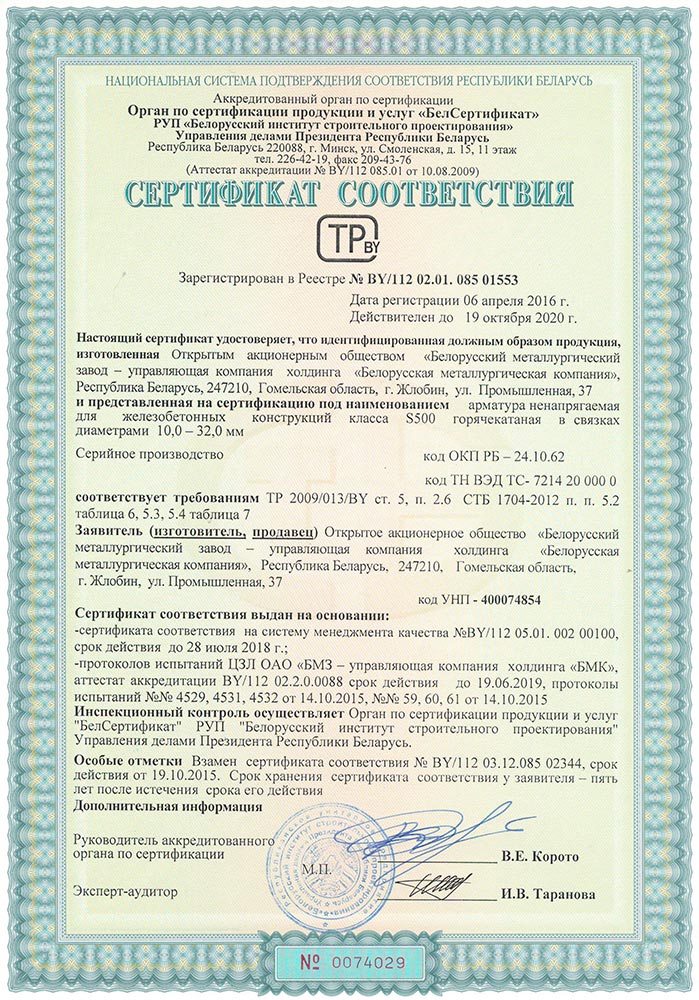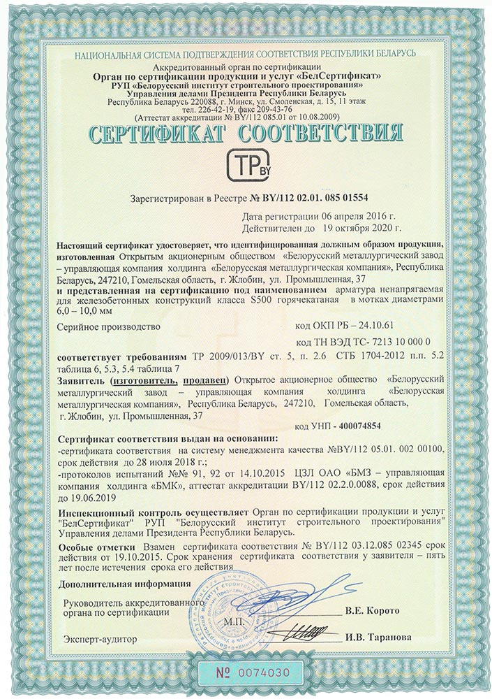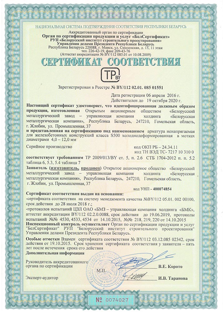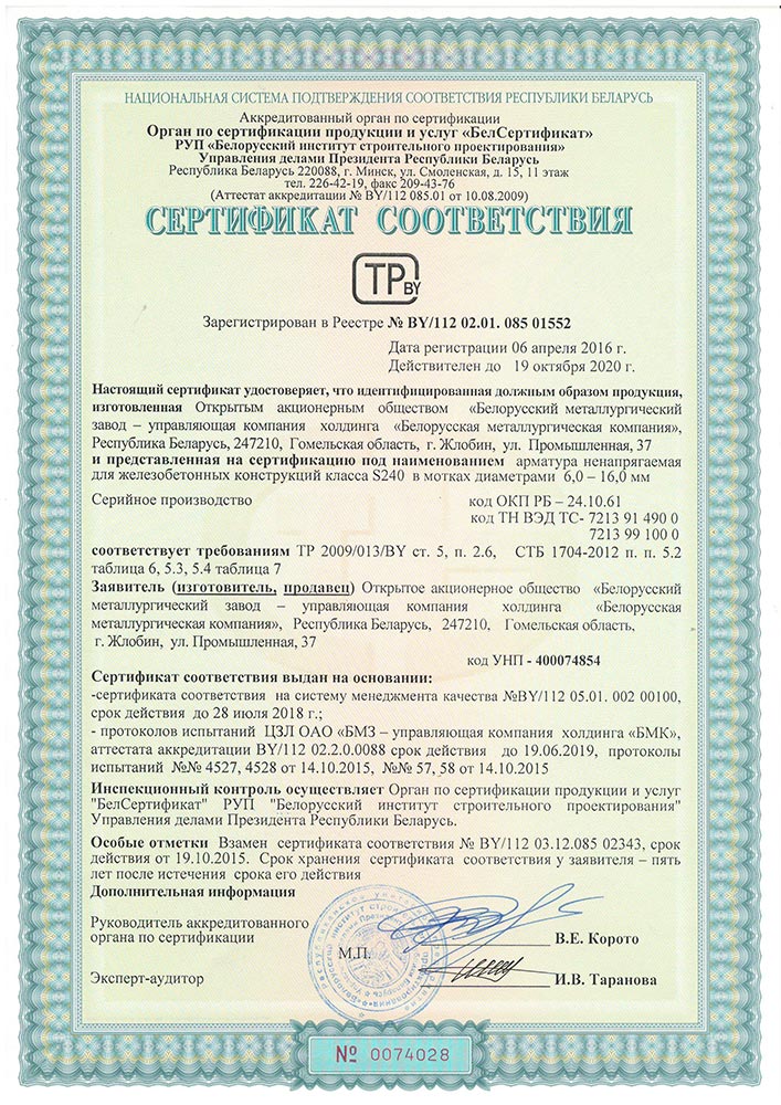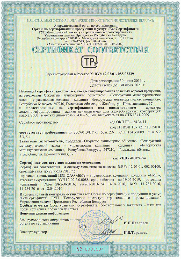 - 24. Certificate № BY/112 02.01.085 02339, (Gosstandard RB) for production of cold-worked plain nonprestressed rebar S500 ( Ø 4,0-5,0 mm) in coils for concrete reinforcement as per STB 1341-2009.