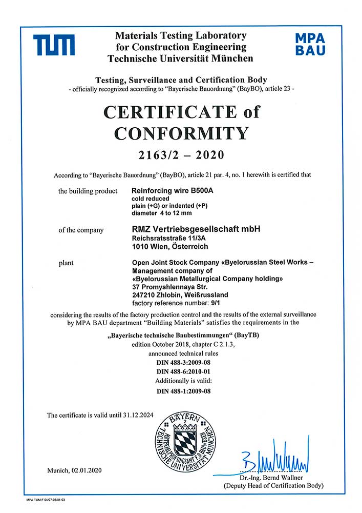 - 25. Certificate №2163/2-2016 (MPA BAU,Germany) for production of cold reduced reinforcing wire B500A plain (+G) or indented (+P) ø 4-12 mm in conformity with DIN 488-3:2009, DIN 488-6:2010 (sign of conformity U)
