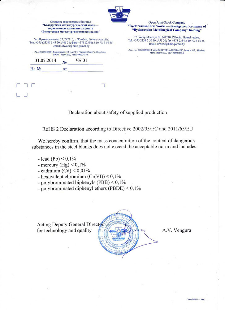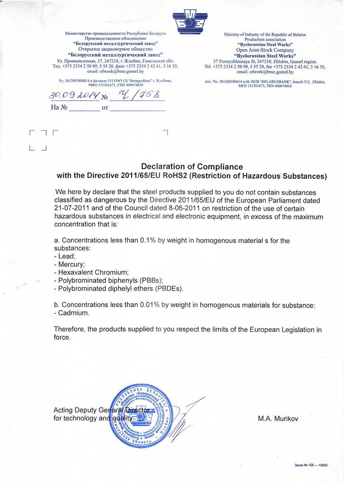 - 10. Certificate № ROSS BY.MO10.Н01126 (GOST-R) for producing hot rolled steel of class А240, А240С Ø 12-36 mm for reinforcing concrete - steel constructions according to the requirements of GOST 34028-2016