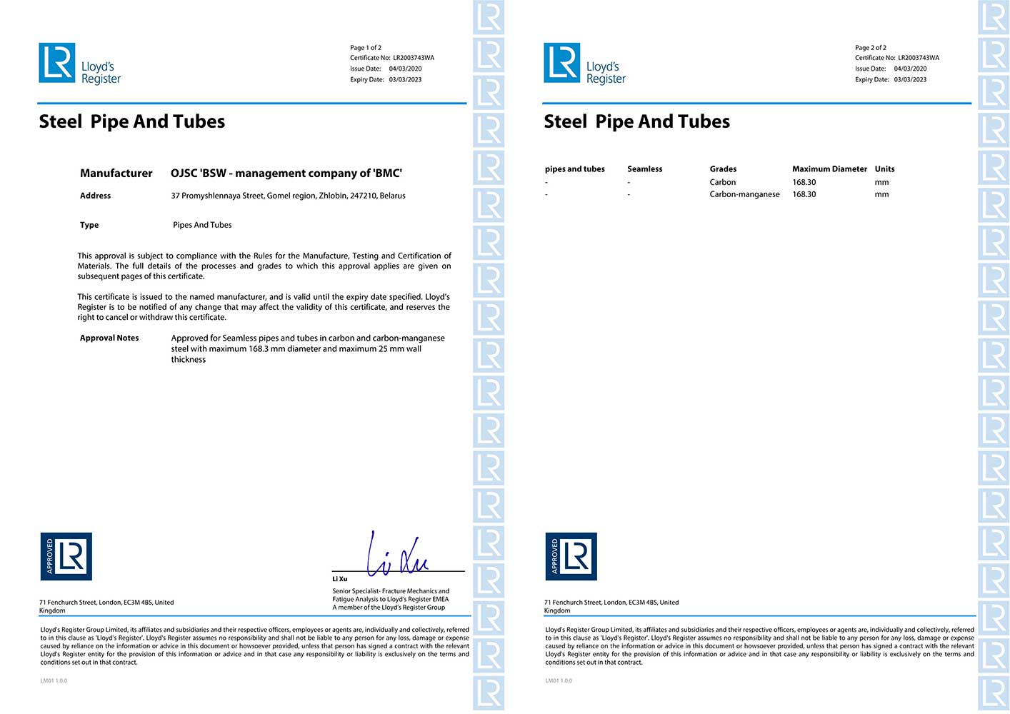 - 29. Certificate No. LR2003743WA Lloyd’s Register EMEA (Great Britain) for production of seamless hot-rolled pipes for shipbuilding from carbon and carbon- manganese steel grades of diameter 168,3 mm and wall thickness 25 mm according to the requirements of Lloyd’s Register Rules