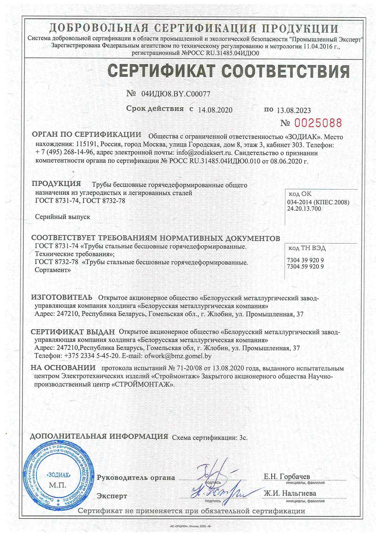 - 3. Conformity certificate No. 04IDYU8.BY.С00077 SERCONS / ZODIAC Ltd (RF) for the production of seamless hot-rolled general-purpose pipes of carbon and alloyed steel grade according to the requirements GOST 8731-74, GOST 8732-78