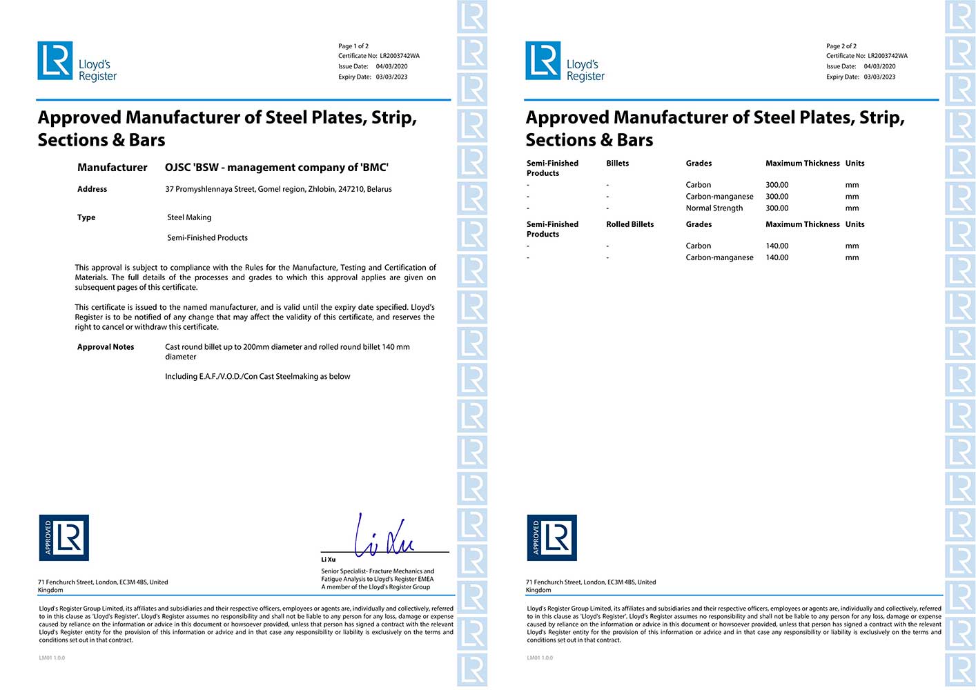 - 30. Certificate No. LR2003742WALloyd’sRegisterEMEA(Great Britain) for production of round cast billet from carbon and carbon – manganese steel grades of diameter up to 200 mm and rolled billet of diameter 140 mm from carbon and carbon – manganese steel grades according to the requirements of Lloyd’s Register Rules.