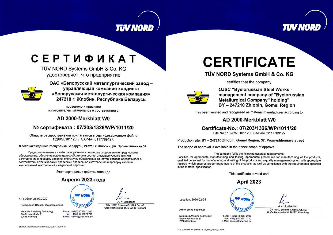 - 31. Certificate of TUV NORD Systems (Germany) № 07-203-1326-WP-1011/20 for production of hot-rolled steel bars and seamless tubes from ferrite steels according to the requirements of AD 2000-Merkblatt W0.