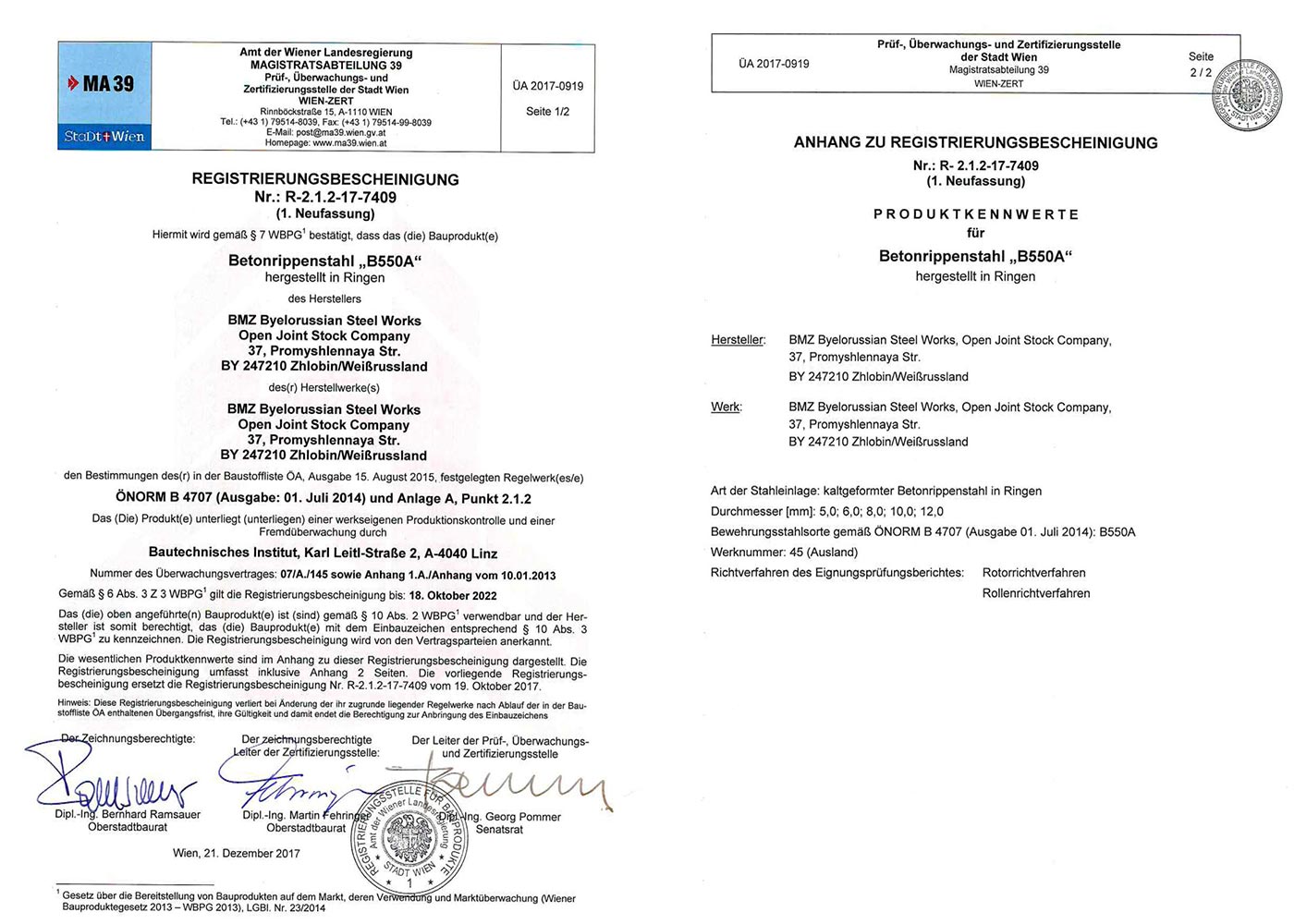 - 32. Certificate No.Z-2.1.2-17-7409 (Wien-Zert, Austria) for production of cold deformed ribbed reinforcing steel B550A with Ø5 - 12 mm according to ONORM B 4707 requirements and Annex A (p. 2.1.2)