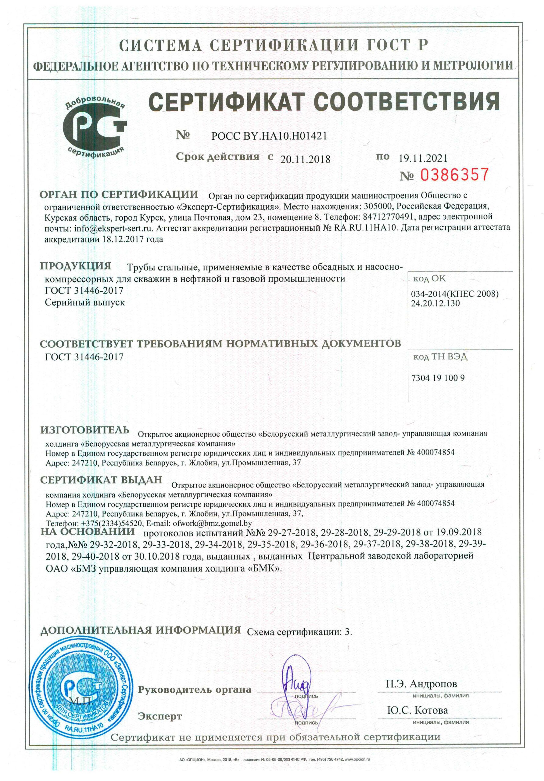 - 33. Certificate No.ROSS BY.HA10.H01421 for hot-deformed seamless pipes used as casing pipe or pump-compressor pipe according to State Standard GOST 31446-2017