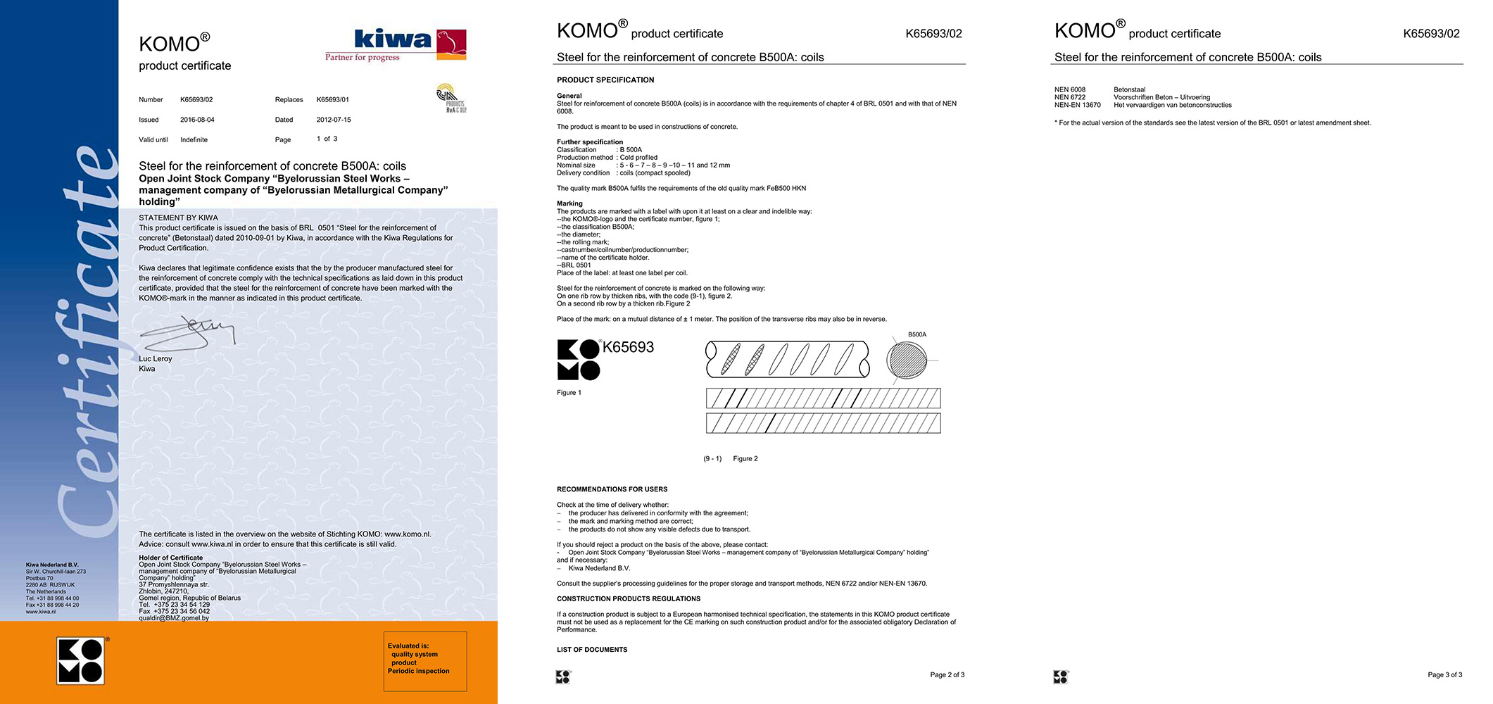 - 34. Certificate KIWA, Holland, No. № К65693/02 for production of reinforcement steel B500А: coils ш 5-12 mm in conformity with BRL 0501 and standard NEN 6008