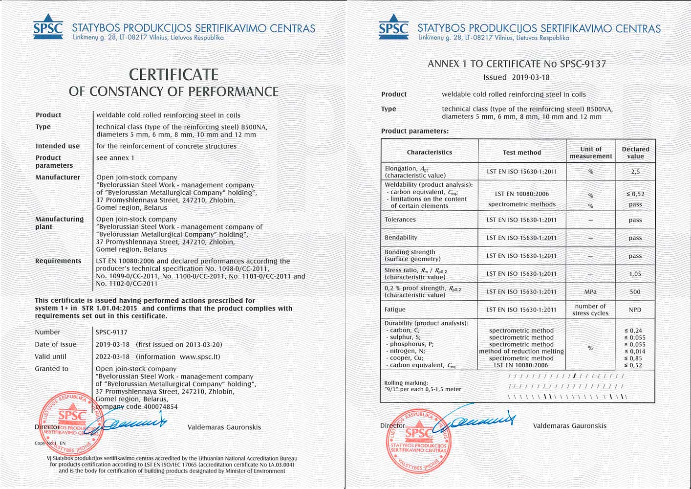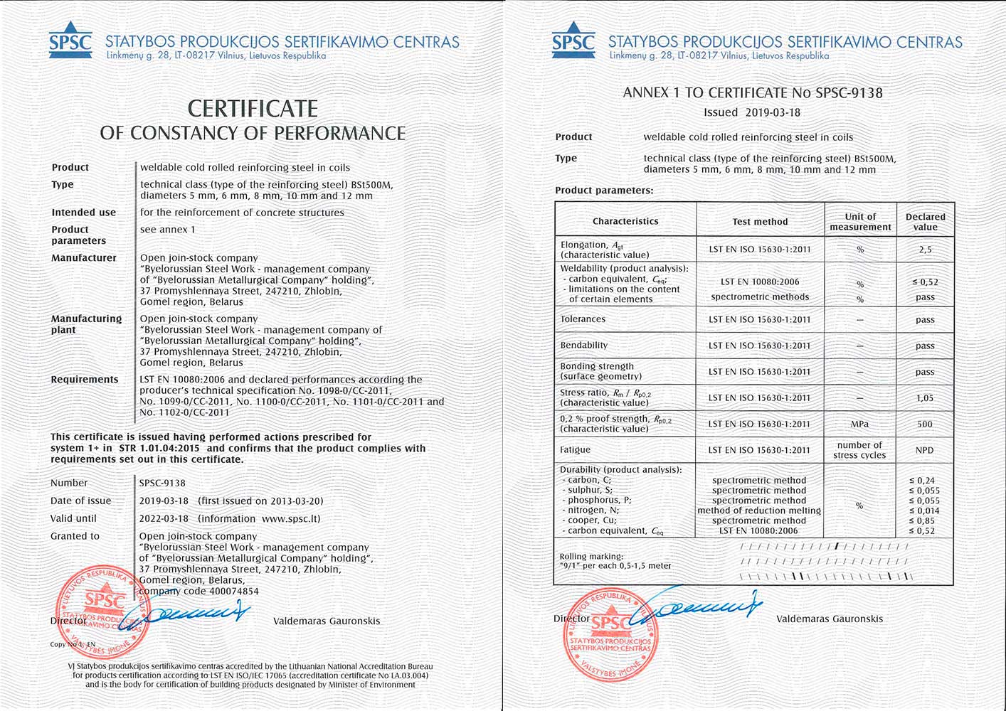 - 37. Certificate«SPSC», Lithuania, No. SPSC-9138 for production of weldable cold-deformed reinforcing steel in coils BSt500M Ø 5,6,8,10,12 mm in conformity with standard LST EN 10080:2006 and producer’s technical specifications No.1098-0/CC-2011, No.1099-0/CC-2011, No.1100-0/CC-2011, No.1101-0/CC-2011, No.1102-0/CC-2011