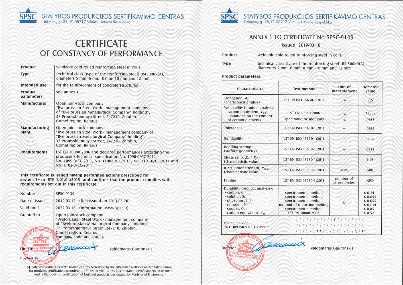 - 36. Certificate«SPSC», Lithuania, No. SPSC-9139 for production of weldable cold-deformed reinforcing steel in coils BSt500KR(A) Ø 5,6,8,10,12 mm in conformity with standard LST EN 10080:2006 and producer’s technical specifications No.1098-0/CC-2011, No.1099-0/CC-2011, No.1100-0/CC-2011, No.1101-0/CC-2011, No.1102-0/CC-2011.