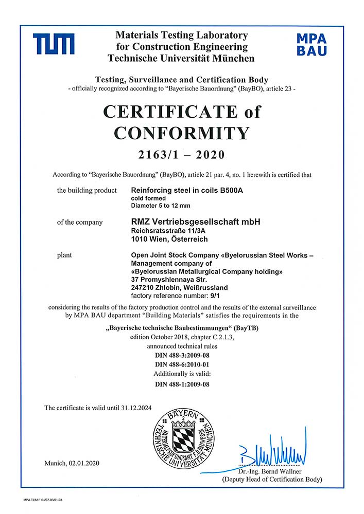 - 38. Certificate MPA BAU, Germany, No. 2163/1-2015 for production of reinforcing steel in coils B500А Ø 5-12 mm in conformity with requirements of DIN 488-1 и 3:2009-08 и DIN 488-6:2010-01.