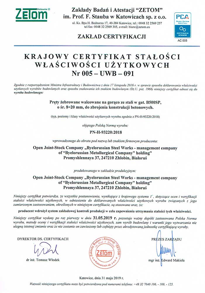 - 39. Certificate No. 005-UWB-091 (ZETOM, Poland) for production of reinforcing steel grade В500SP in bars of diameter 8- 20 mm for concrete reinforcement of building constructions in compliance with PN-H-93220:2018