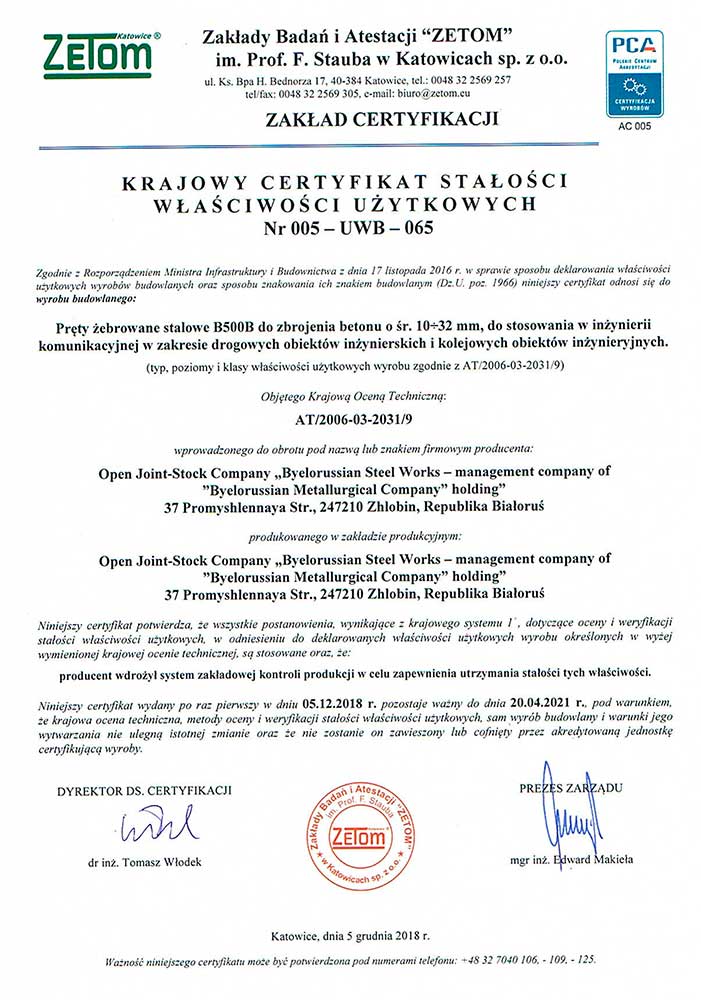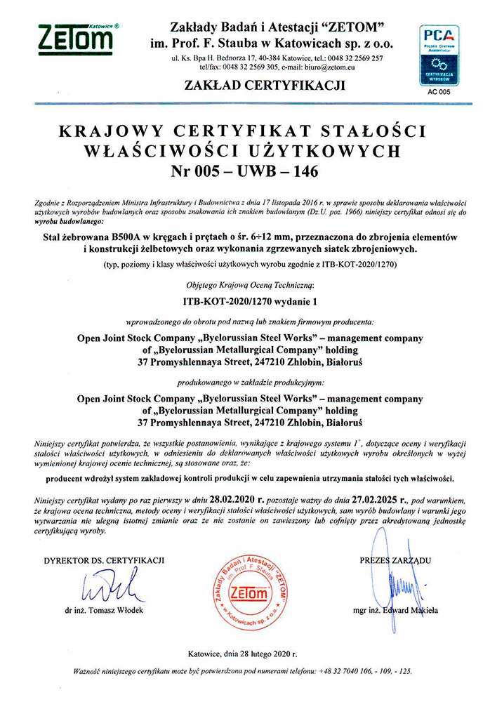 - 4. Certificate of Conformity No. 005-UWB-146 (ZETOM, Poland) for the production of ribbed steel in coils and bars В500А Ø 6-12 mm, for concrete reinforcement, as well as for the production of welded reinforcing mesh in accordance with the technical approval ITB -KOT-2020/21270
