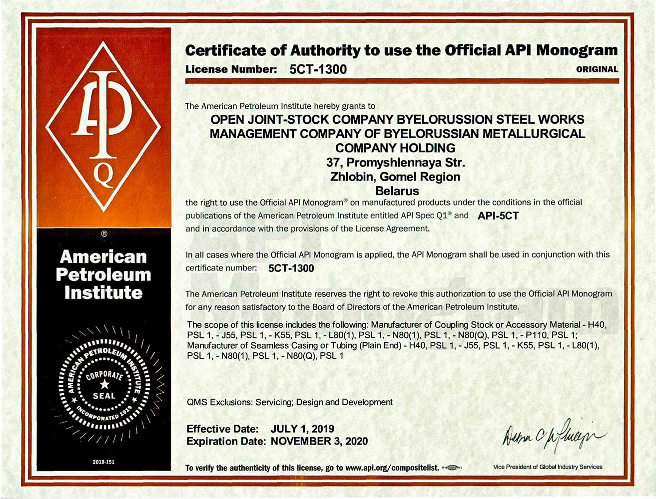 - 47. Certificate of Authority № 5CT-1300 (American Petroleum Institute) to use the Original API Monogram – manufacture of coupling stock Group1, H40/PSL 1, J55/PSL 1, K55/PSL 1, N80(1)/PSL 1 and N80(Q)/PSL 1, Group-2, L80(1)/PSL 1, Group-3, P110/PSL 1; manufacture of seamless casing or tube plain end Group-1, H40/PSL 1, J55/PSL 1, K55/PSL 1, N80(1)/PSL 1 and N80(Q)/PSL 1 , Group-2, L80(1)/PSL1
