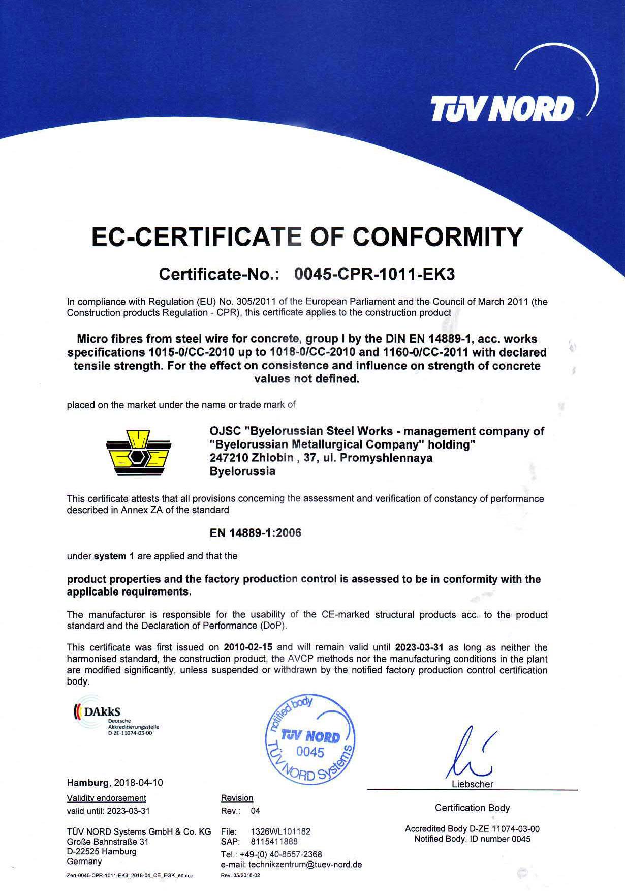 - 48. Certificate TUV NORD (Germany)No0045-CPR-1011-EK3 for production of steel microfiber for concrete according to the requirements of EN 14889-1:2006 and European building regulations 305/2011 (right to apply CE-mark).