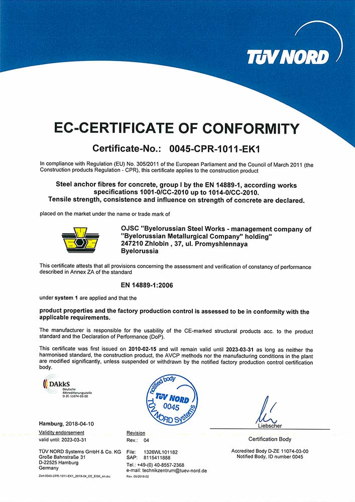 - 5. Certificate of conformity № 0045-CPR-1011-EK1 (TUV NORD Systems, Germany) to produce steel anchor fiber for concrete reinforcement according to EN 14889-1:2006 and European construction regulation 305/2011 (right to apply СЕ marking)