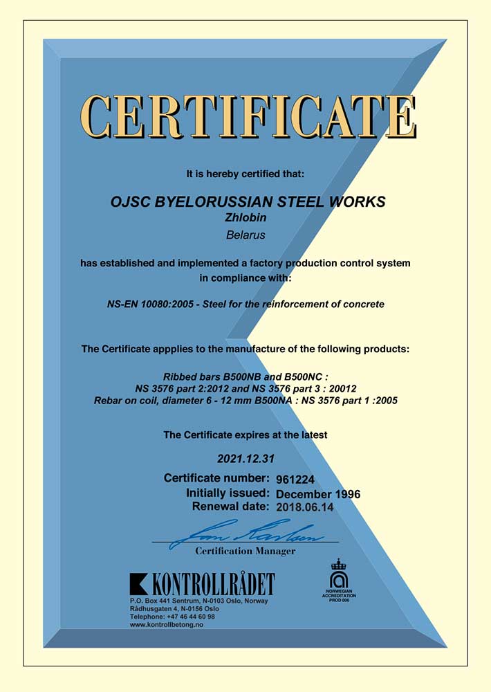 - 50. Certificate Kontrollradet, Norway, for production of rebars B500NB and B500NC ø 10-40 on requirements of national standards NS-EN 10080:2005 and NS 3576, parts 2 and 3 and cold deformed reinforcement wire ø 6-12 mm B500NA on requirements of NS 3576 part 1.