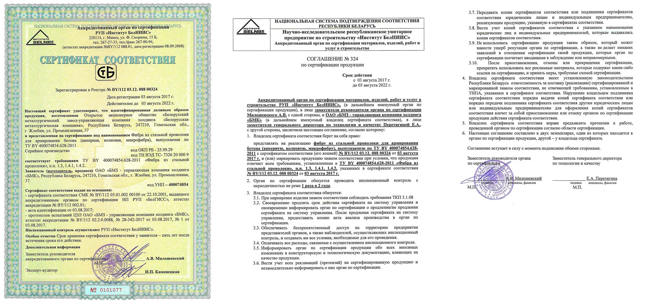 - 2. Conformity certificate No. 04IDYU8.BY.C00076 SERCONS / ZODIAC Ltd (RF) for the production of fiber from steel wire: anchor, wavy, microfiber according to the requirements of TU 14-1-5564-2008 with amendment 4