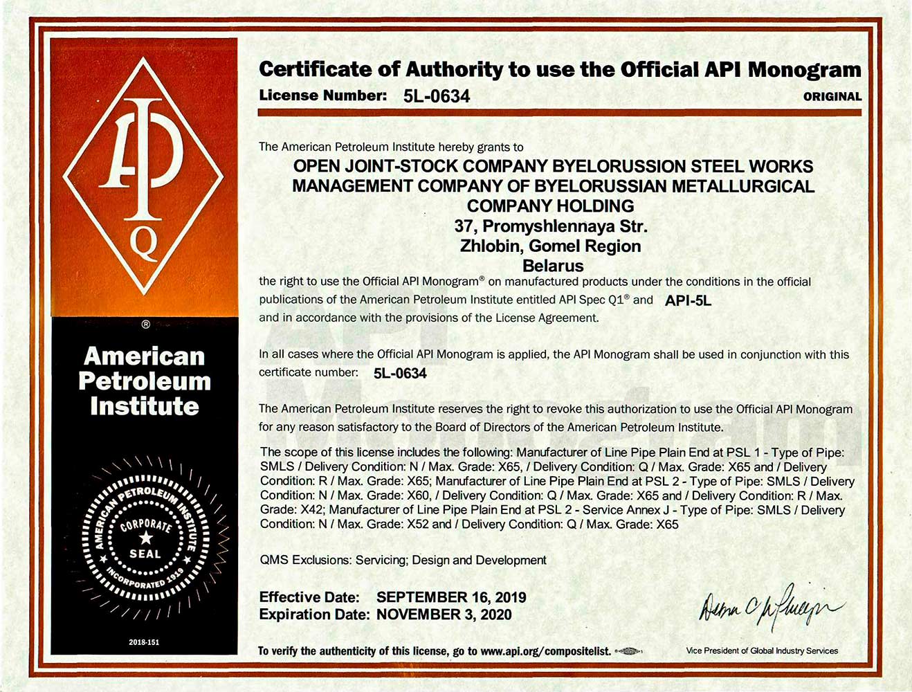 - 53. Certificate of Authority № 5L-0634 to use the API Monogram Spec 5L – manufacture of Line Pipe Plain End at PSL 1 – Type of Pipe: SMLS/Delivery Condition N/Max. Grade: X65and/ Delivery Condition R/Max/ Grade X65; manufacture of Line Pipe Plain End at PSL 2 – Service Annex J – Type of Pipe: SMLS/ Delivery Condition: N / Max. Grade: X52 and/ Delivery Condition: Q/ Max. Grade: X65.