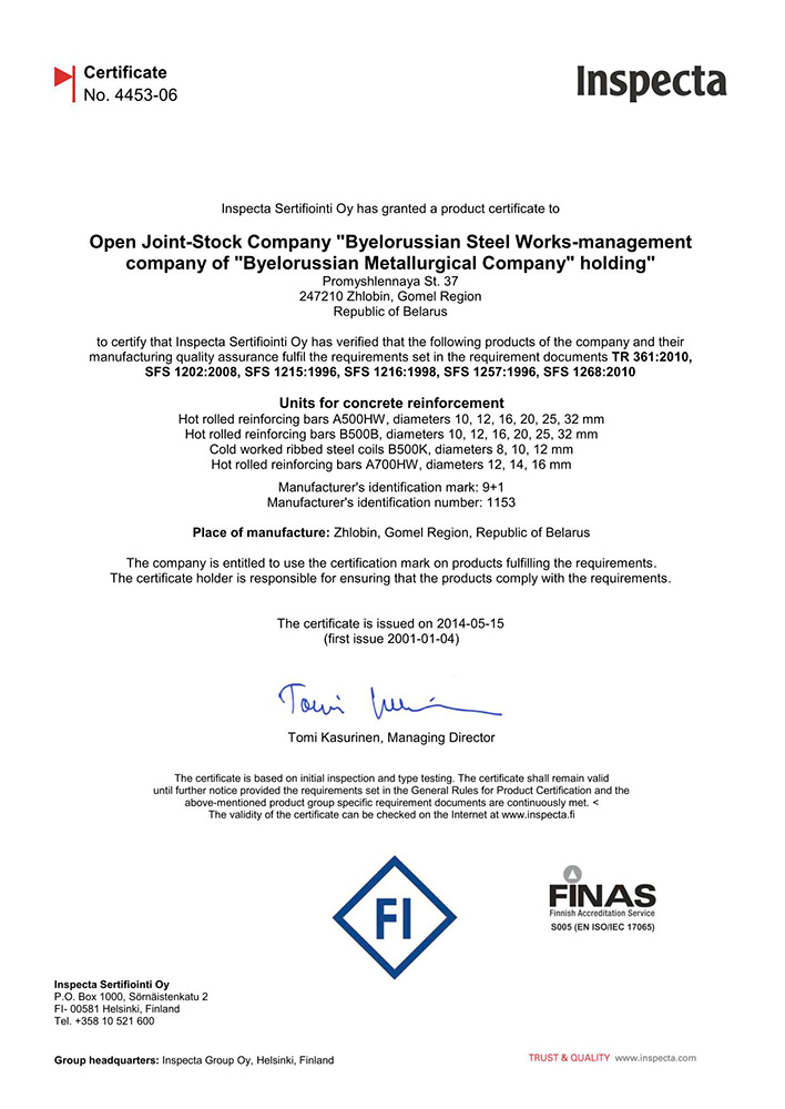 - 54. Inspecta Certificate (Finland) №4453-06 for production of hot rolled reinforcing bars A500HW ø 10, 12, 16, 20, 20, 25 and 32mm, hot rolled reinforcing bars B500B ø 10, 12, 16, 20, 20, 25 and 32mm, cold deformed ribbed steel coils B500K ø 8, 10 and 12mm, hot rolled reinforcing bars A700HW ø 12, 14 and 16mm according to the requirement documents TR 361:2010, SFS 1202:2010, SFS 1202:2008, SFS 1215:1996, SFS 1216:1998 and SFS 1268:2010.