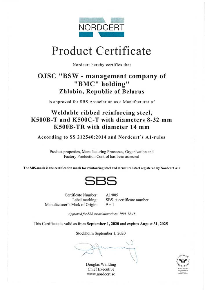 - 55. Certificate SBS (Sweden) No. A1/005 (NORDCERT, Sweden) for production of weldable ribbed reinforcing steel K500B-T, K500C-T in diameters 10-32 mm and reinforcing steel in coils K500B-TR