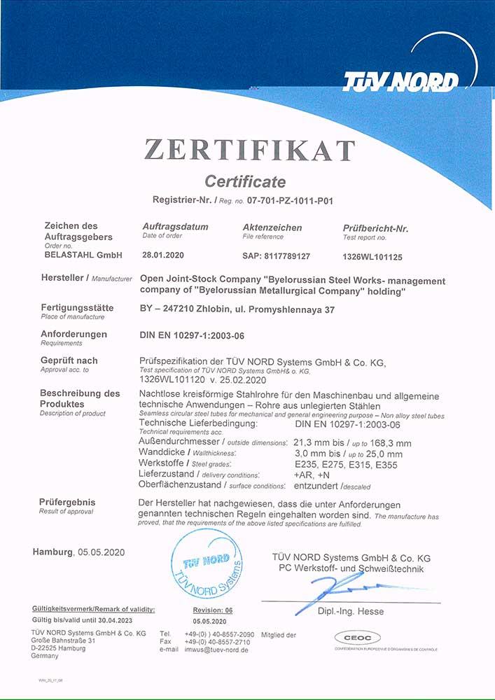 - 56. Certificate of compliance TUV-NORD No.07-701-PZ-1011-P01 for production of pipes from steel grades E235, E275, E315, E355 ø 21,3-168,3mm with wall thickness range 3,0-25mm to the requirements of DIN EN 10297-1:2003-06.