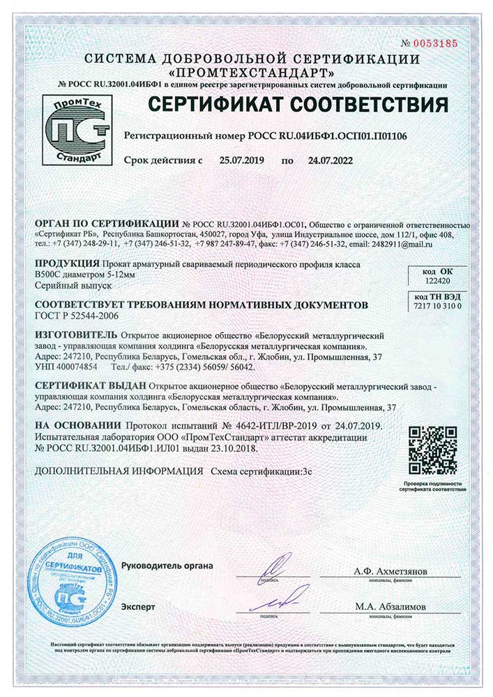 - 6. Certificate of conformance No. ROSS RU.04IBF1.OSP01.P01106 (Promtechstandart) for production weldable deformed reinforcing bars grade В500С Ø 5-12 mm according to requirements GOST R 52544-2006
