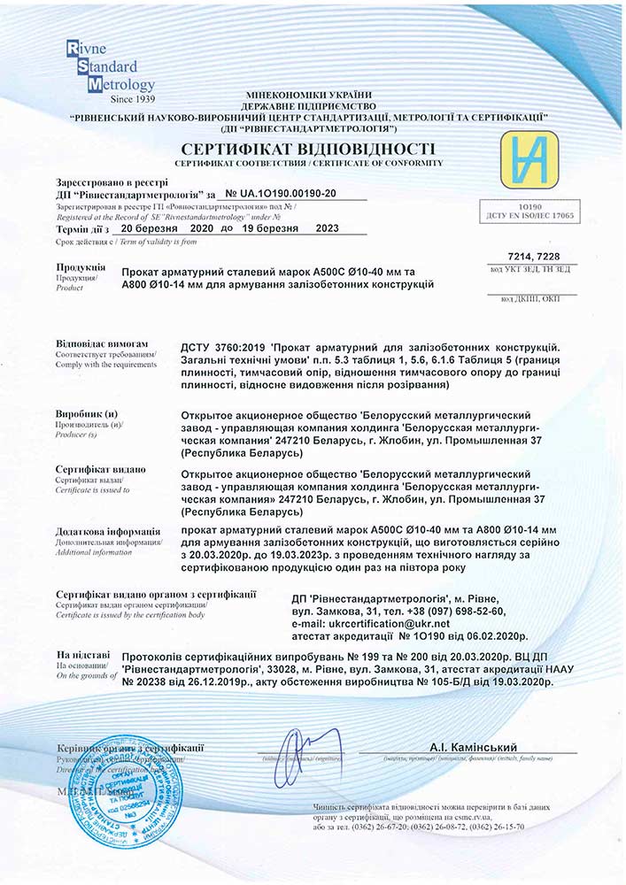 - 7. Certificate №UA.1O190.00190-20 (Rovnostandardmetrology, Ukraine) to produce steel rebars of grades А500С Ø10-40 mm and А800 Ø10-14 mm for concrete reinforcement according to DSTU 3760:2006