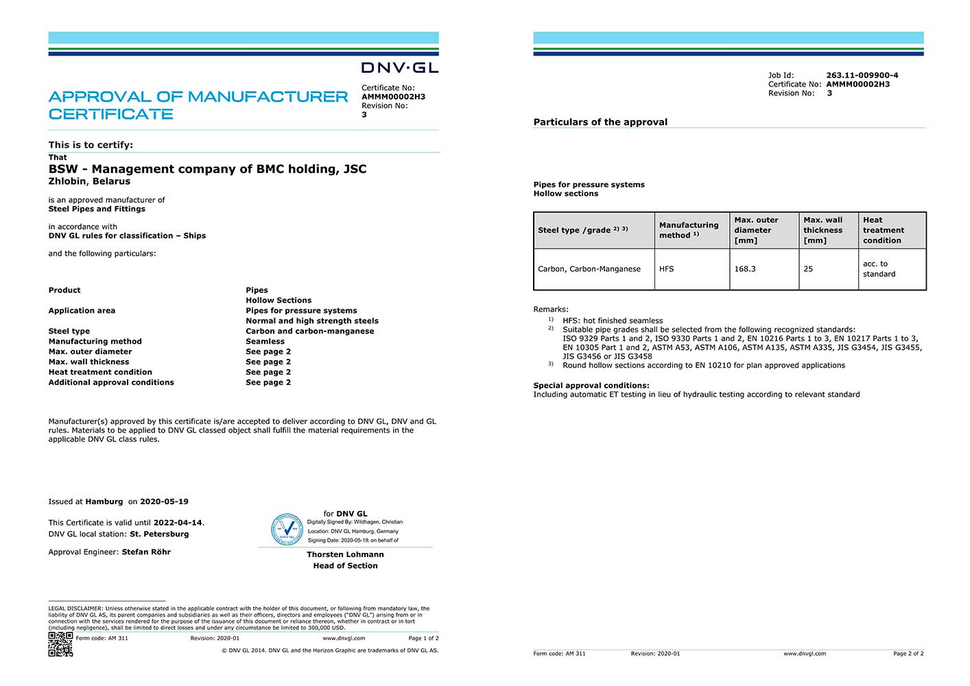 - 8. Certificate of conformity № АММ00002H3(DNV, Norway) for manufacture of seamless hot-rolled pipes for shipbuilding from carbon and carbon – manganese steel grades of diameter up to 168, 3 mm and wall thickness up to 25mm according to DNV GL Rules for classification “Ships” and standard EN 10210