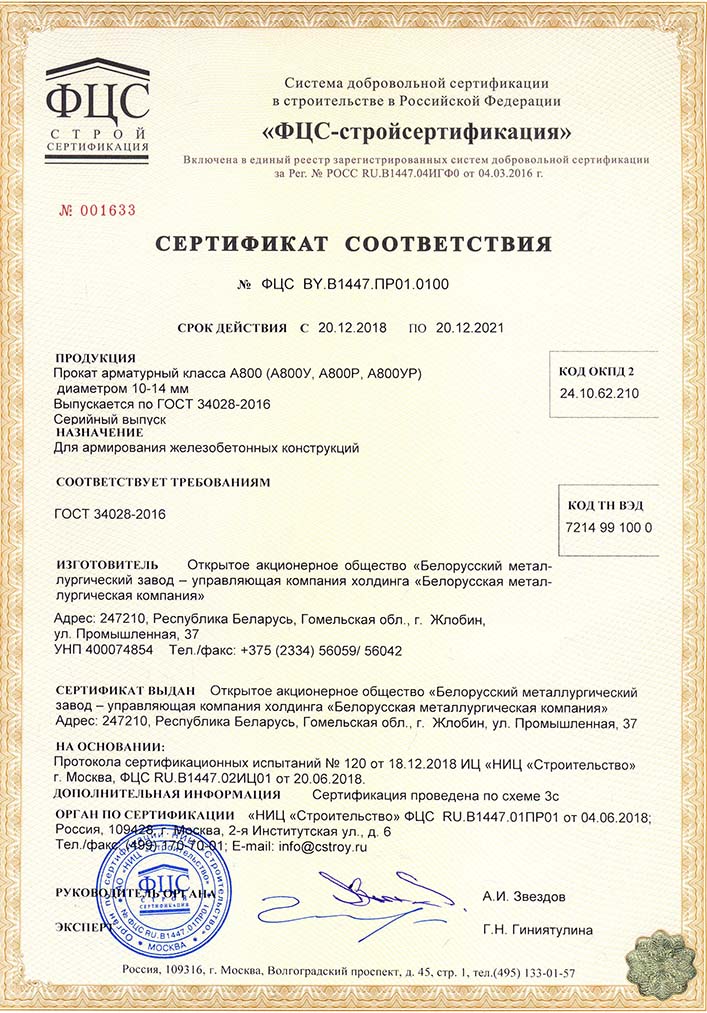 - 9. Certificate of conformance No. FTsS BY.B1447.PR01.0100 «FTsS-stroicertification» for production of reinforcing bars grade А800 (F800U, А800R, А800UR) Ø 10-14 mm according to requirements GOST 34028-2016